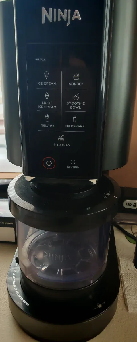 Gelatiera Ninja per preparare gelati, sorbetti e frullati. - Funzioni: Ice Cream, Light Ice Cream, Gelato, Sorbet, Smoothie Bowl, Milkshake. - Pulsante Re-Spin. - Pulsante di accensione/spegnimento.