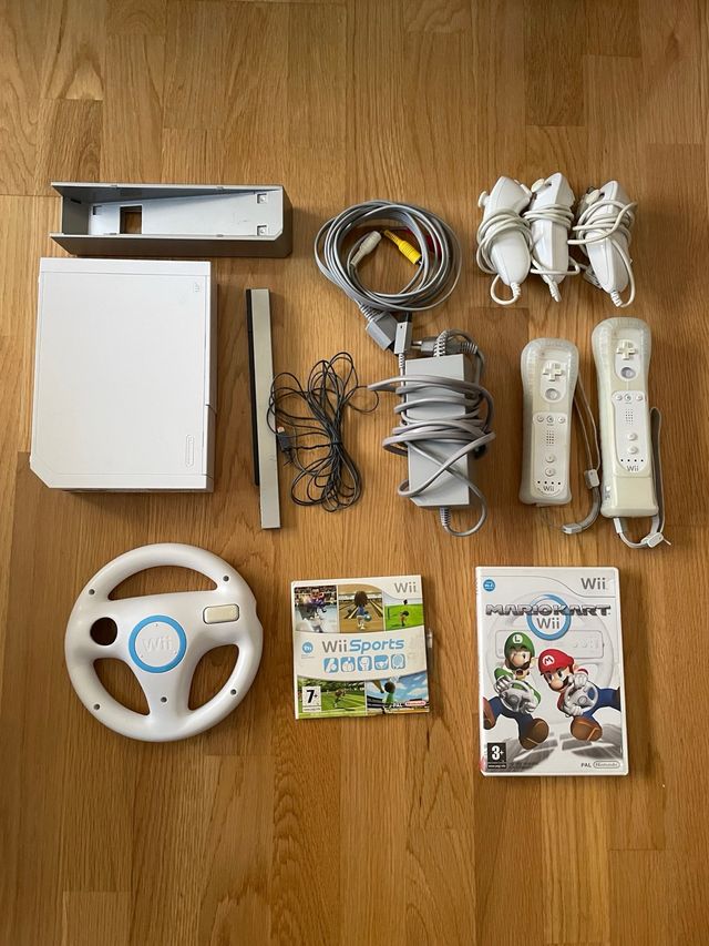 Dettagli del prodottoConsola Nintendo Wii con vari accessori e giochi. Include: console Wii, 2 telecomandi Wii Remote e 3 Nunchuks, volante per giochi, gioco Wii Sports e gioco Mario Kart Wii. La descrizione è stata tradotta automaticamente.