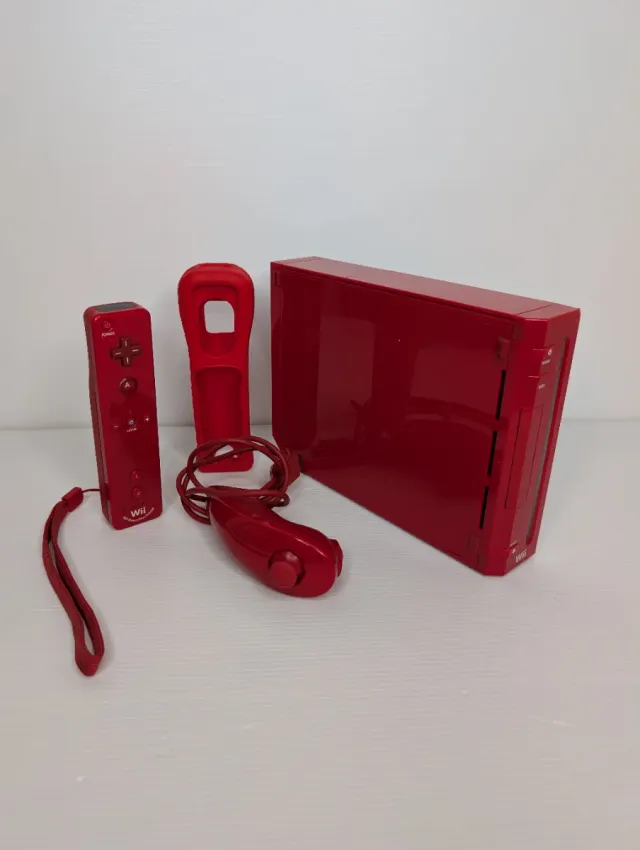 Console Nintendo Wii in edizione limitata rossa, versione americana (Regione NTSC-U), ideale per collezionisti o per chi possiede titoli d'importazione. Il lotto include la console modello RVL-001, un telecomando Wii Remote Plus coordinato con guscio protettivo e un Nunchuk rosso. L'unità è funzionante ma presenta un segno di usura su un angolo della scocca con la plastica leggermente ammaccata, come visibile nelle foto di dettaglio. Su richiesta, posso fornire il cavo di alimentazione compatibile con le prese europee.