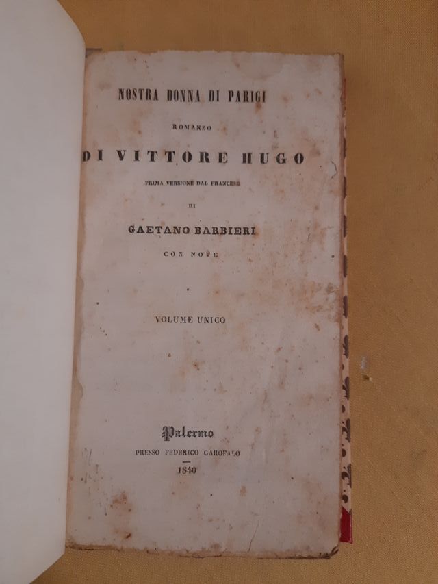 Vittore Hugo: Nostra Signora Di Parigi - Gaetano Barbieri. Palermo Presso Federico Garofalo 1840 Prima Versione dal francese.