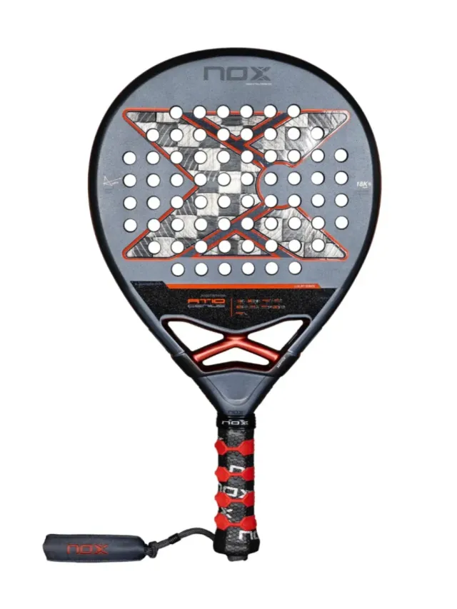 Dettagli del prodottoRacchetta da padel Nox AT10 18k, modello 2025. Design moderno con finiture grigie e dettagli rossi.