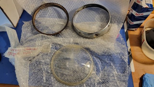 Lente faro anteriore Bosch per NSU Prinz 4, 4L completa di cornice esterna e flangia posteriore interna ORIGINALE.