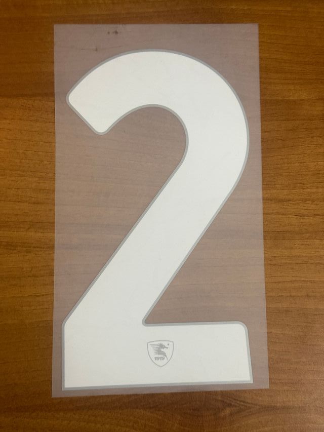 Numero 2 ufficiale della Salernitana per la Serie A, con stemma e anno 1919. - Colore bianco con bordo grigio. - Stemma societario presente.