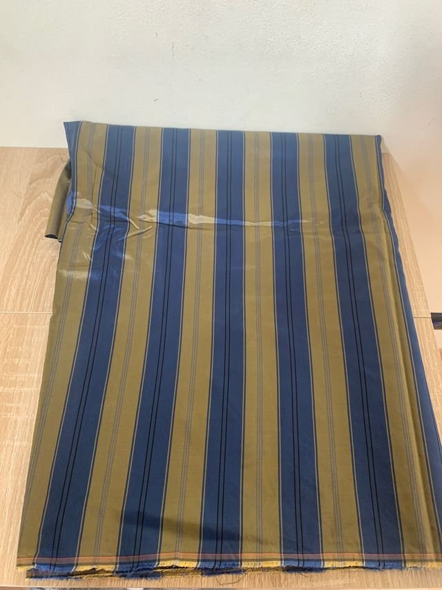 Dettagli del prodottoNuovo scampolo di stoffa a righe blu e dorato , ( la consistenza del tessuto è ideale per camicie o vestiti leggeri , le misure sono : larghezza 134 Cm ( a scampolo aperto ) la lunghezza 310 Cm