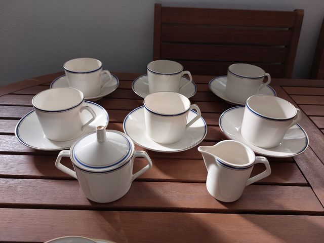 Dettagli del prodottoNUOVO Set da tè / caffè, duplice uso, stile classico composto da 6 tazzine con relativo piattino, una caraffa, una zuccheriera e una lattiera. Il tutto coordinato, decorato con semplice riga blu e oro.