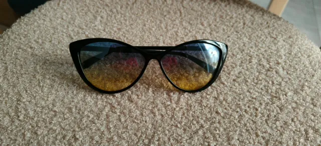 Occhiali da sole con montatura nera e lenti sfumate dal blu al giallo.