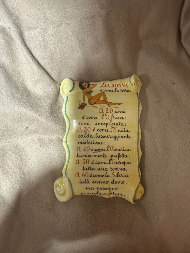 Dettagli del prodottoOggetto decorativo in ceramica con una citazione divertente sulla donna e le età.