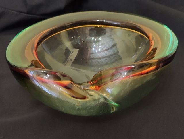 Dettagli del prodottoScodella di Murano vintage anni '70 in vetro sommerso ,color verde e ambra .