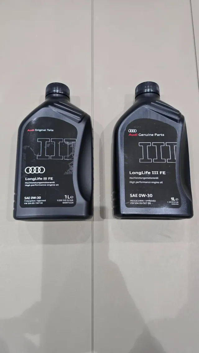 Due flaconi di olio motore Audi LongLife III FE. - Grado di viscosità SAE 0W-30. - Specifiche VW 504 00/507 00. - Capacità 1 Litro ciascuno.