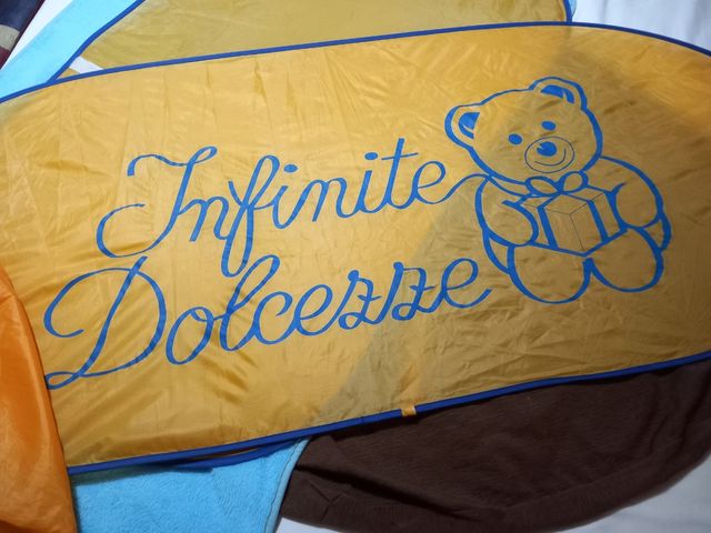 Ombreggiante gadget "Infinite dolcezze". 2 teli assemblabili tramite velcri e richiudibili in una pratica borsa. Utile, leggero e pratico.
