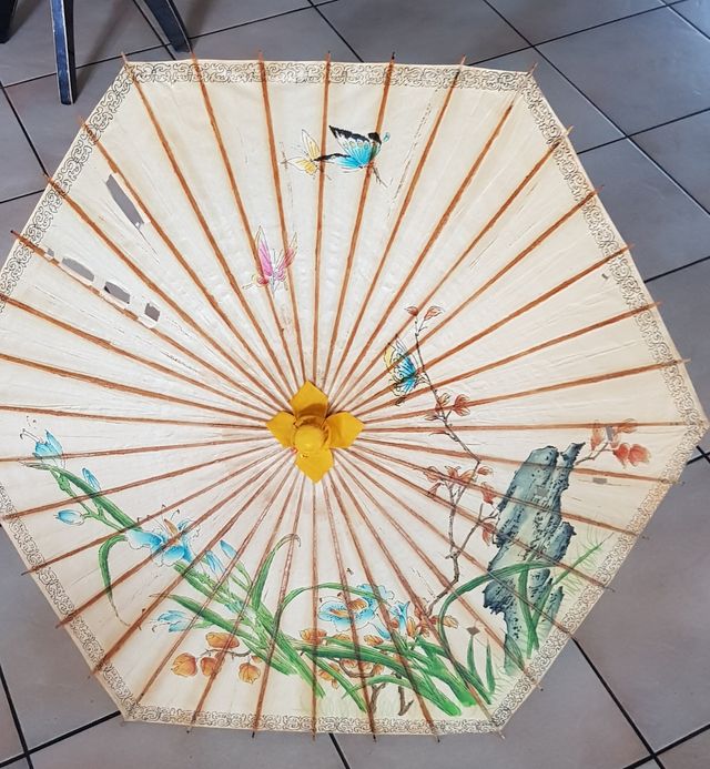Ombrello cinese anni 90 artigianale, in bambù e carta di riso decorato a mano, purtroppo con strappi, comunque bello da esposizione