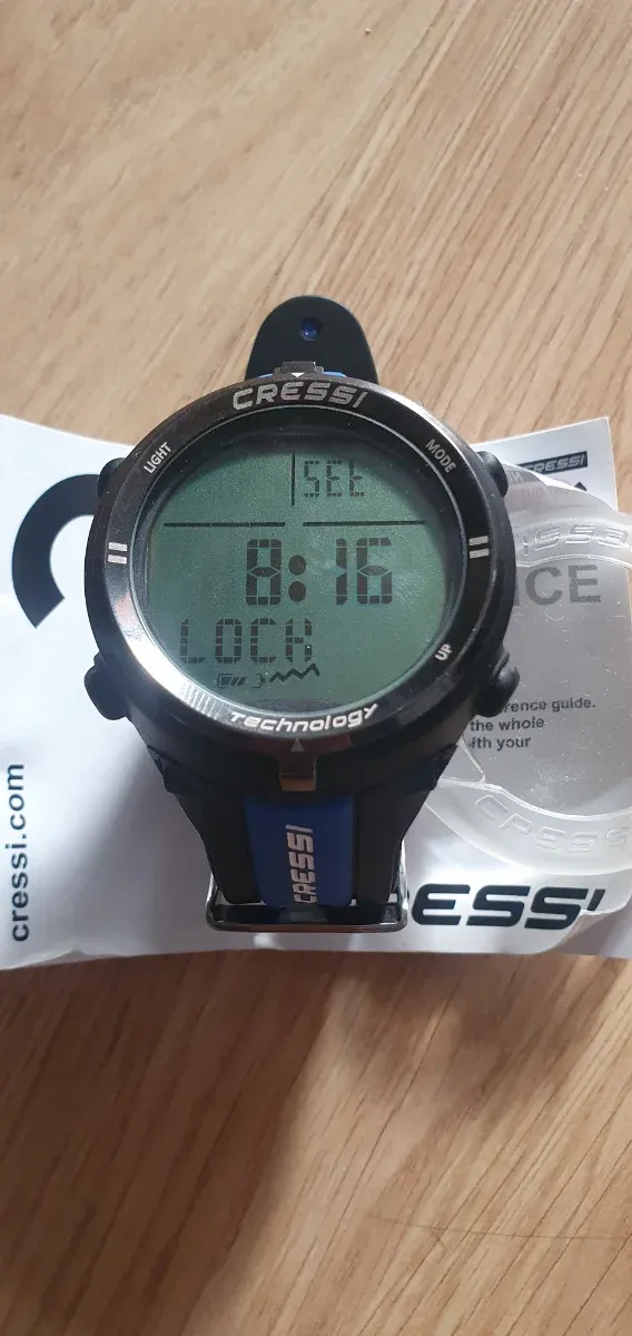 Dettagli del prodottoComputer da sub Cressi Newton con display digitale. Progettato per le immersioni. - Utilizzo molto limitato. - Display con informazioni per immersioni. - Pulsanti di controllo. - Cinturino di fissaggio. - Marca: Cressi. La descrizione è stata tradotta automaticamente.