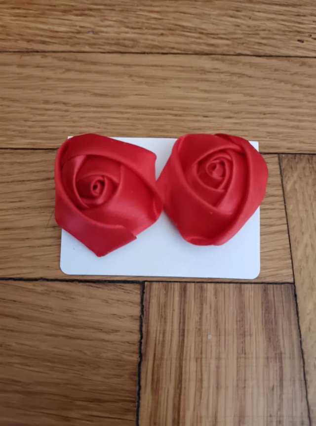 Deliziosi orecchini a forma di fiore, rosa, in tessuto. Glinorecchini bijoux bigiotteria hanno una chiusura con tip in silicone molto comoda e pratica. Usati solo per uno spettacolo teatrale.