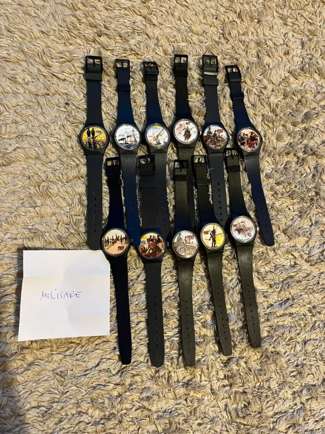 Dettagli del prodottoLotto di 11 orologi Swatch con tema militare.