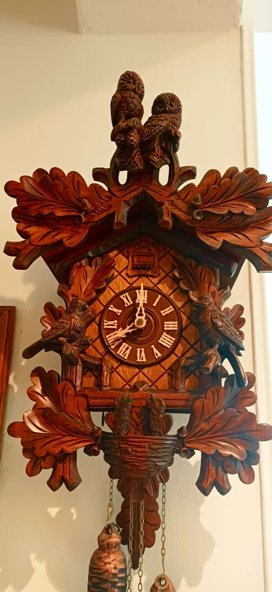 Dettagli del prodottoBellissimo orologio a cucù in legno scuro, finemente intagliato con dettagli di foglie e uccelli.