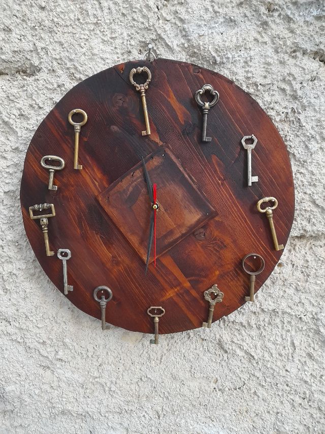 Dettagli del prodottoOrologio da parete in legno massello colore noce antico con 12 chiavi diverse. 42 cm Misure del prodotto
