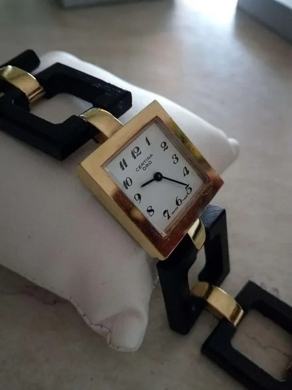 Dettagli del prodottoElegante orologio vintage Certina con cassa dorata e cinturino in maglia nera e oro. Bellissimo ed unico orologio vintage marca CERTINA modello "Oro" a carica manuale Swiss Made risalente alla fine degli anni "60, inizi anni "70. Orologio molto particolare, tutto originale, in quanto possiede un bracciale "pop art" in legno ed acciaio, placcato oro, originale Certina. Cassa quadrata 25X25 mm. placcata oro, fondello in acciaio chiuso a pressione. Orologio rarissimo in condizioni impeccabili praticamente mai indossato, fondo