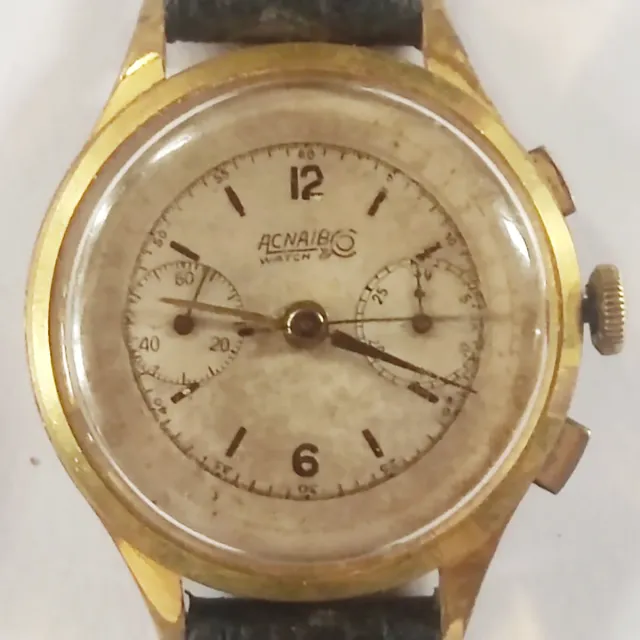 Dettagli del prodottoElegante orologio cronografo ACNAIB WATCH carica manuale usato funzionante, diametro cassa 37mm senza corona, cassa dorata, come nelle foto visto e piaciuto.