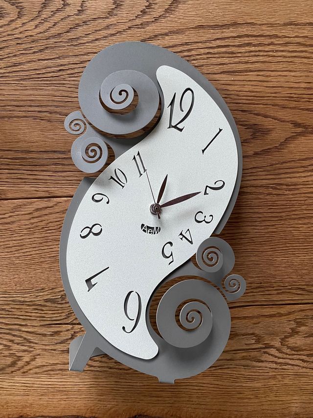 Orologio in ferro da appendere in stile moderno ed elegante, con caratteristici riccioli sia sopra che sotto al quadrante. Colore fango e avorio.