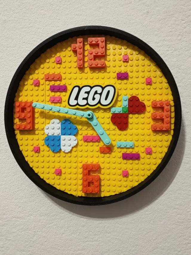 Orologio da parete con un design ispirato ai mattoncini LEGO. - Base gialla con texture a bottoncini. - Numeri e logo LEGO in rilievo. - Lancette colorate.