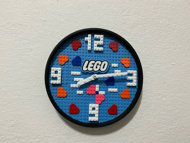 Orologio da parete con un design ispirato ai mattoncini LEGO. - Quadrante blu. - Numeri e logo LEGO. - Decorazioni a forma di cuore colorate.