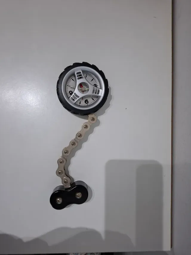 Originale orologio da scrivania a forma di ruota con catena. - Design unico a tema moto. - Base nera con viti a vista.