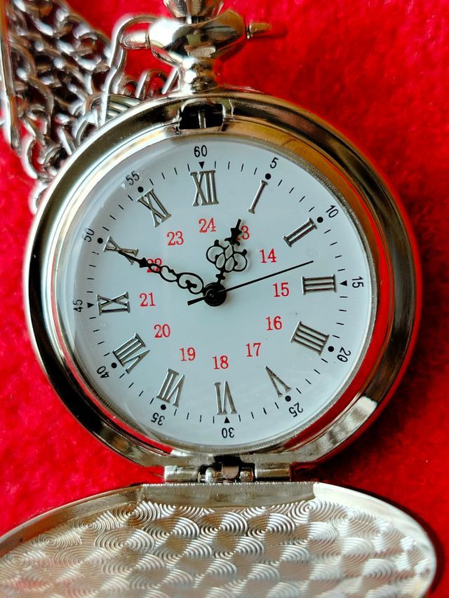Dettagli del prodottoOrologio da tasca color argento- Quadrante bianco con numerazione romana col. argento per le 12 ore e numerazione araba di colore rosso per le 24 ore - Sfere o lancette (h.m.s.) di colore nero stile Luigi XV - Sportellino a