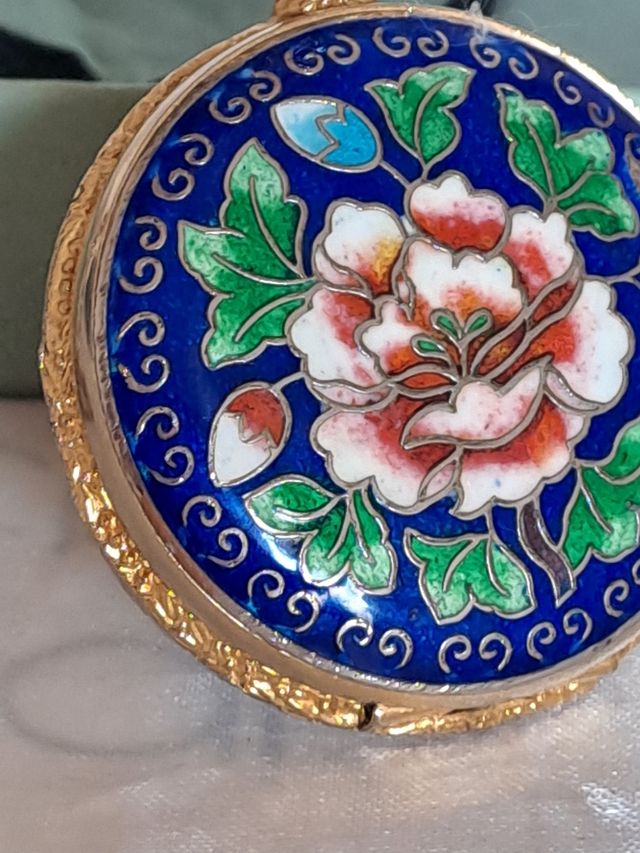 Dettagli del prodottoBellissimo orologio da tasca con decorazioni floreali in smalto Cloisonné. firmato Kidult, nella sua scatola originale