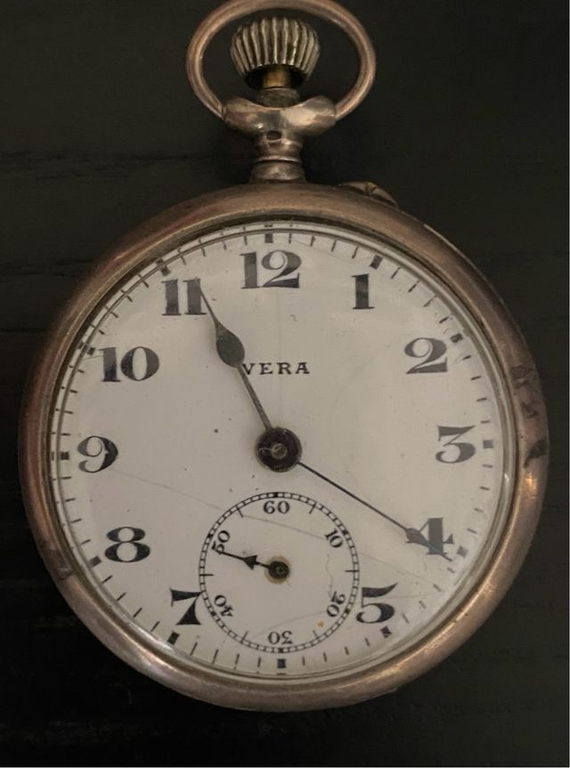Dettagli del prodottoOrologio da tasca con quadrante bianco e numeri arabi.