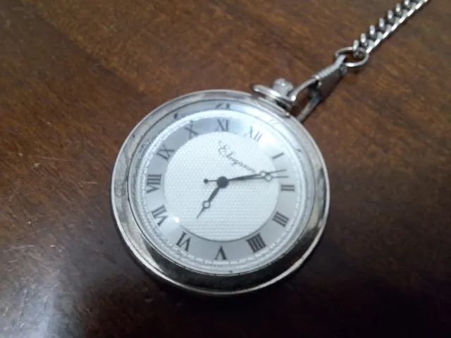 Elegante orologio da taschino con catena. - Quadrante bianco con numeri romani. - Lancette delle ore e dei minuti. - Catena in metallo argentato.