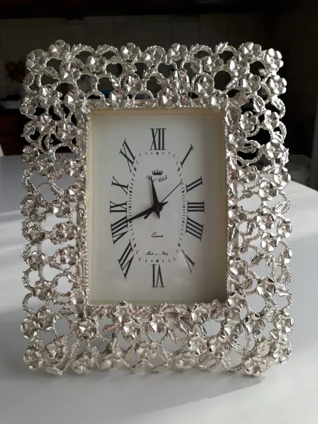 Dettagli del prodottoElegante orologio da tavolo con una cornice decorata con motivi floreali.
