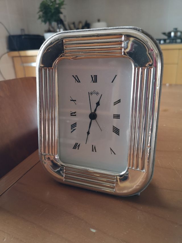 Dettagli del prodottoOrologio da tavolo, con cornice in silver plated. Alimentato a batteria 1,5 volt. Dimensione: 18x14 cm Funzionante con qualche piccola imperfezione come da foto.