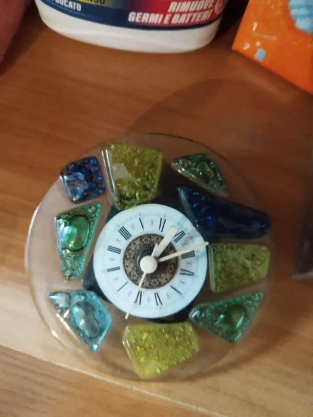 Orologio da tavolo con un design unico e colorato. - Quadrante con numeri romani. - Decorazioni in vetro colorato. - Base rotonda trasparente.
