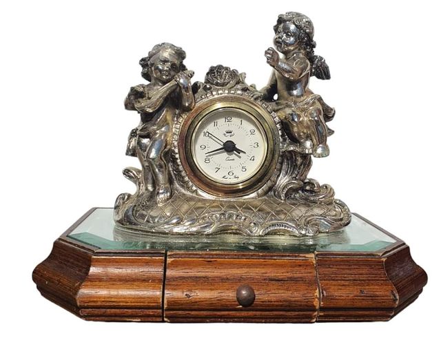 Orologio da tavolo vintage con cassettino, misure: Altezza 18.cm, Larghezza 24 cm. Prezzo 30 euro!!!! Mister Shop.