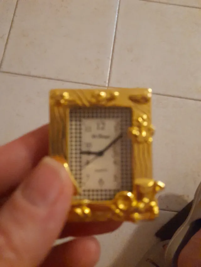 Dettagli del prodottoElegante orologio da tavolo vintage con cornice dorata.