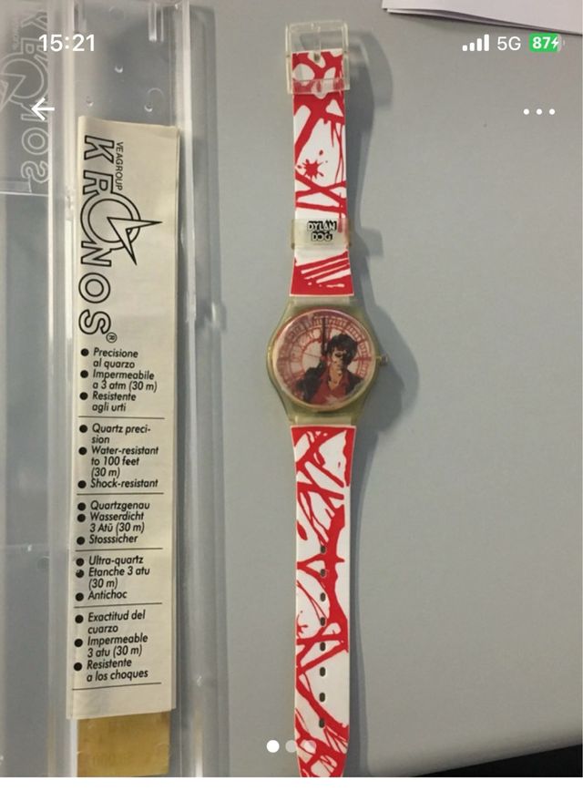 Dettagli del prodottoOrologio da polso con cinturino bianco e rosso a tema Dylan Dog. Il quadrante presenta un'illustrazione del personaggio.