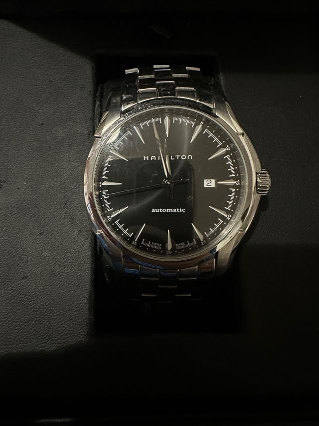 Elegante orologio Hamilton da uomo con movimento automatico. - Quadrante nero. - Datario. - Bracciale in acciaio. - Made in Swiss inciso sul quadrante.