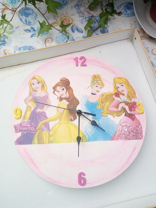 Dettagli del prodottoBellissimo orologio da parete, dipinto a mano, con decorazioni decoupage raffiguranti le principesse Disney Cinderella, Belle, Rapunzel e Sleeping Beauty. Perfetto per la cameretta dei bambini! Artigianale, hand made, nuovo realizzato artigianalmente. Numeri in morbida gomma applicati su base legno dipinta.
