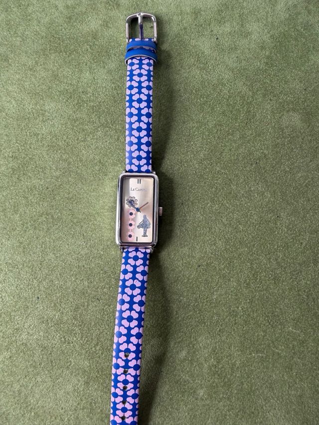 - Cinturino in pelle blu con fantasia di cuori rosa.