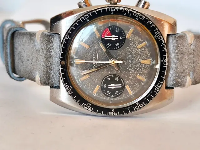 Dettagli del prodottoOrologio Levrette da regata con cronografo. Presenta un quadrante grigio con indici dorati e due contatori.funzionante