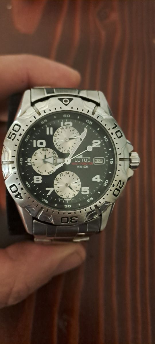 Orologio da polso Lotus con quadrante nero e cinturino in acciaio. Presenta indicatori per giorno, data e mese. - Cassa in acciaio. - WR.100M. Con scatola e documenti originali