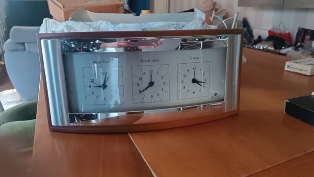 Dettagli del prodottoBellissimo orologio da tavolo Marcello Giorgio con tre fusi orari: New York, ora locale e Tokyo. L'orologio è in ottime condizioni ed è realizzato in legno e metallo.