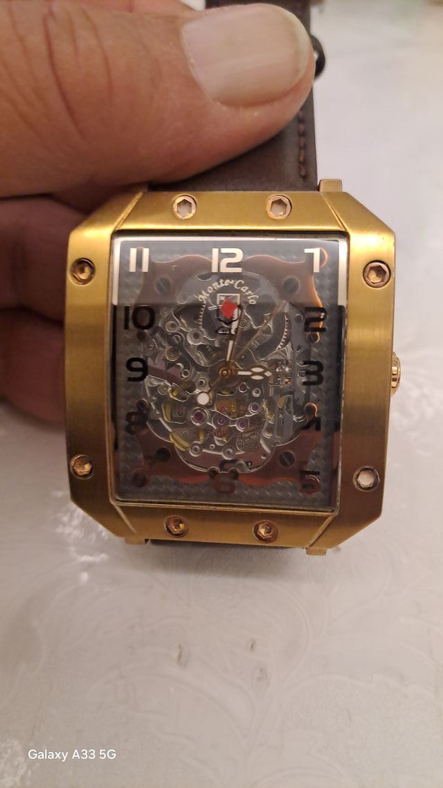 Dettagli del prodottoElegante orologio da uomo Montecarlo con movimento scheletrato a vista. La cassa è in metallo color oro e il cinturino è in pelle marrone.