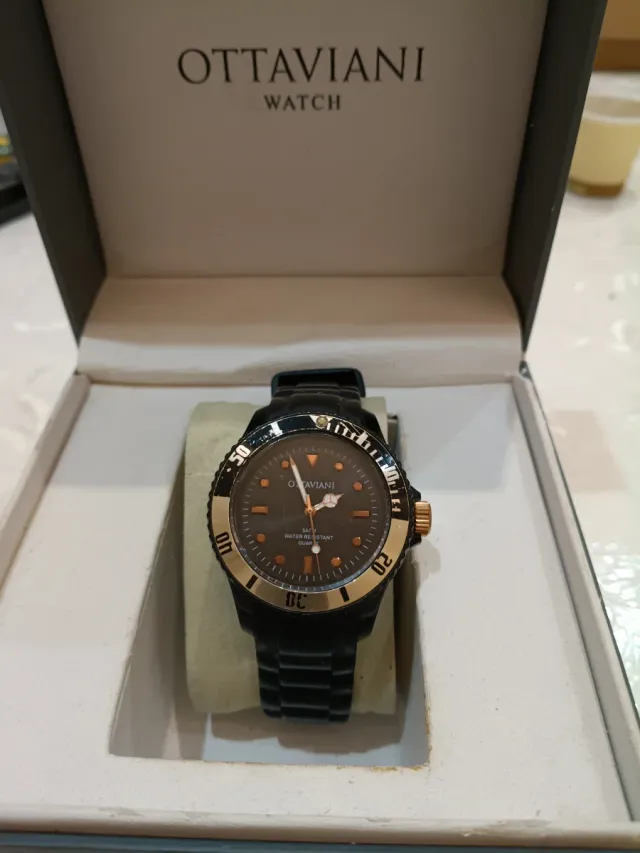 Dettagli del prodottoElegante orologio da polso Ottaviani con cassa e cinturino neri, dettagli in oro.