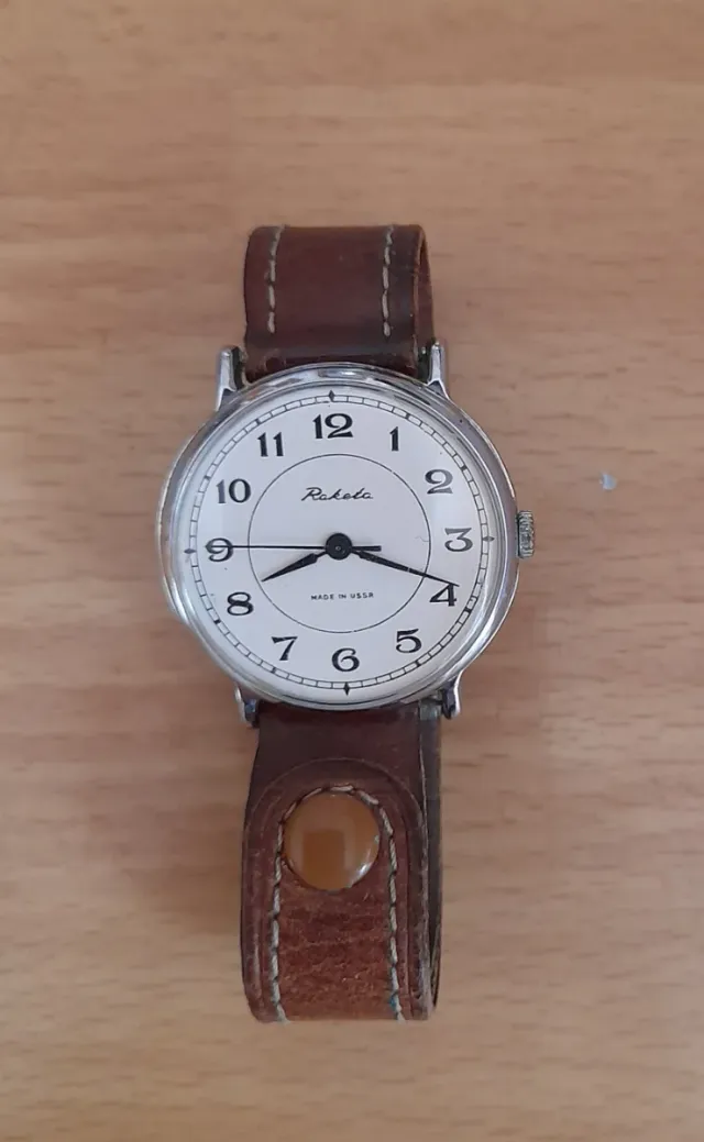 Dettagli del prodottoOrologio originale sovietico Raketa vintage meccanico a carica manuale. Con cinturino originale in pelle con evidenti segni del tempo. Funzionante e il quadrante non ha graffi.