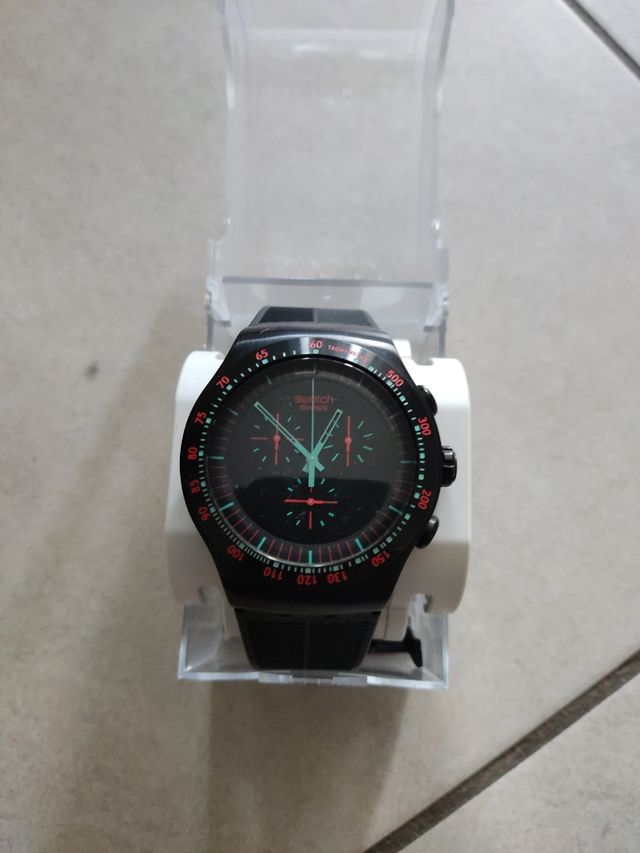 Orologio Swatch con cronografo. - Quadrante nero con dettagli rossi e verdi. - Cinturino in gomma nero.
