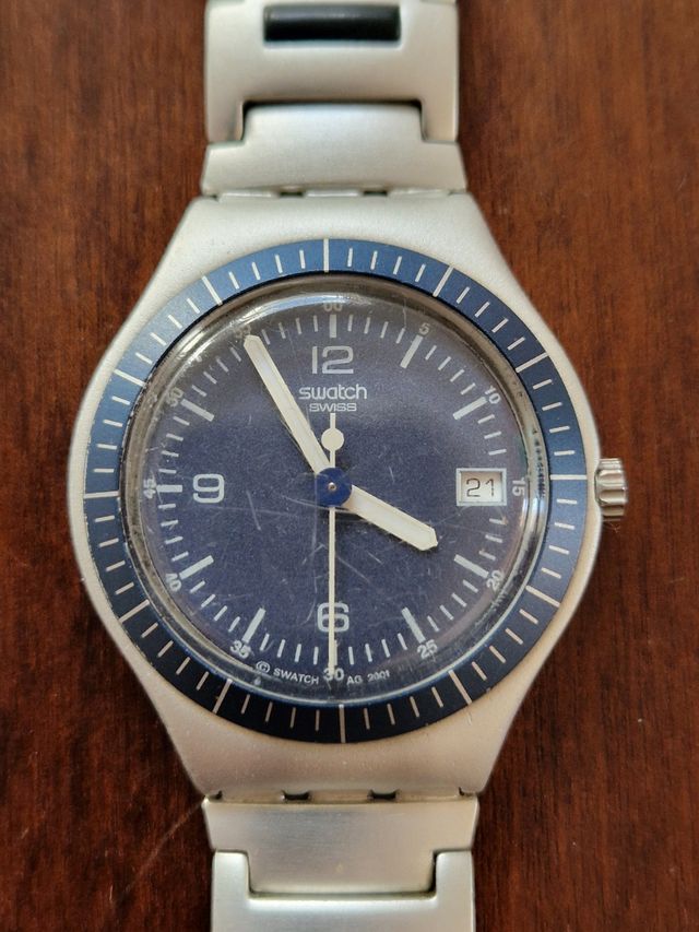 Dettagli del prodottoOrologio Swatch Irony Alluminio Solo Tempo vintage con quadrante blu.