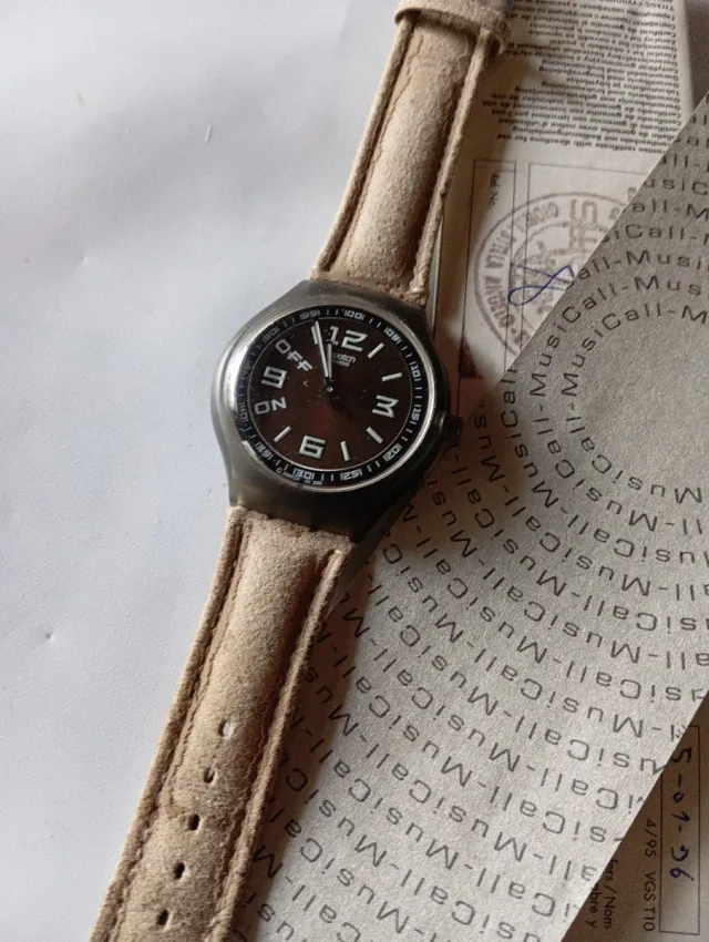 Orologio Swatch musical con cinturino in pelle scamosciata color sabbia,un po' vissuto.Purtroppo parzialmente funzionante,non riesco a regolarlo.Si muovono le lancette schiacciando la corona in modo disordinato,ma non comprendo se funziona o meno.Lo vendo così com'è.Il prezzo ne tiene conto