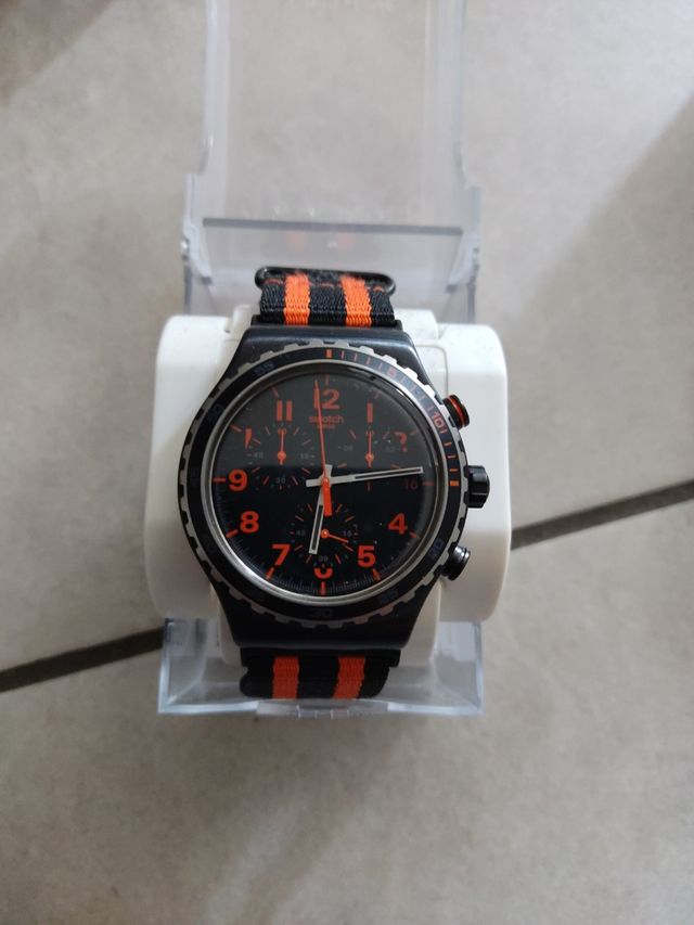 Orologio Swatch con cinturino a righe nere e arancioni. - Quadrante nero. - Dettagli arancioni sul quadrante e sul cinturino. - Cronografo.