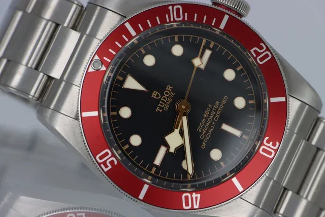 Dettagli del prodottoOrologio Tudor Geneve con cassa in acciaio e lunetta rossa. Il quadrante nero presenta indici applicati e lancette luminescenti.